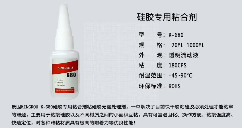 景固KINGKOU K-680硅膠專用粘合劑粘硅膠無(wú)需處理劑,一舉解決了目前快干膠粘硅膠必須處理才能粘牢的難題,主要用于粘接硅膠以及不同材質(zhì)之間的小面積互粘,具有可室溫固化、操作方便、粘接強(qiáng)度高、快速定位,對(duì)各種難粘材質(zhì)具有極高的附著力等優(yōu)良性能!