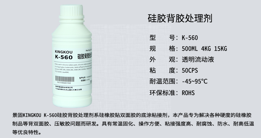 景固KINGKOU K-560硅膠背膠處理劑系硅橡膠貼雙面膠的底涂粘接劑,本產(chǎn)品專為解決各種硬度的硅橡膠制品等背雙面膠、壓敏膠問題而研發(fā)。具有操作方便、粘接強(qiáng)度高、耐腐蝕、防水、耐高低溫等優(yōu)良特性。