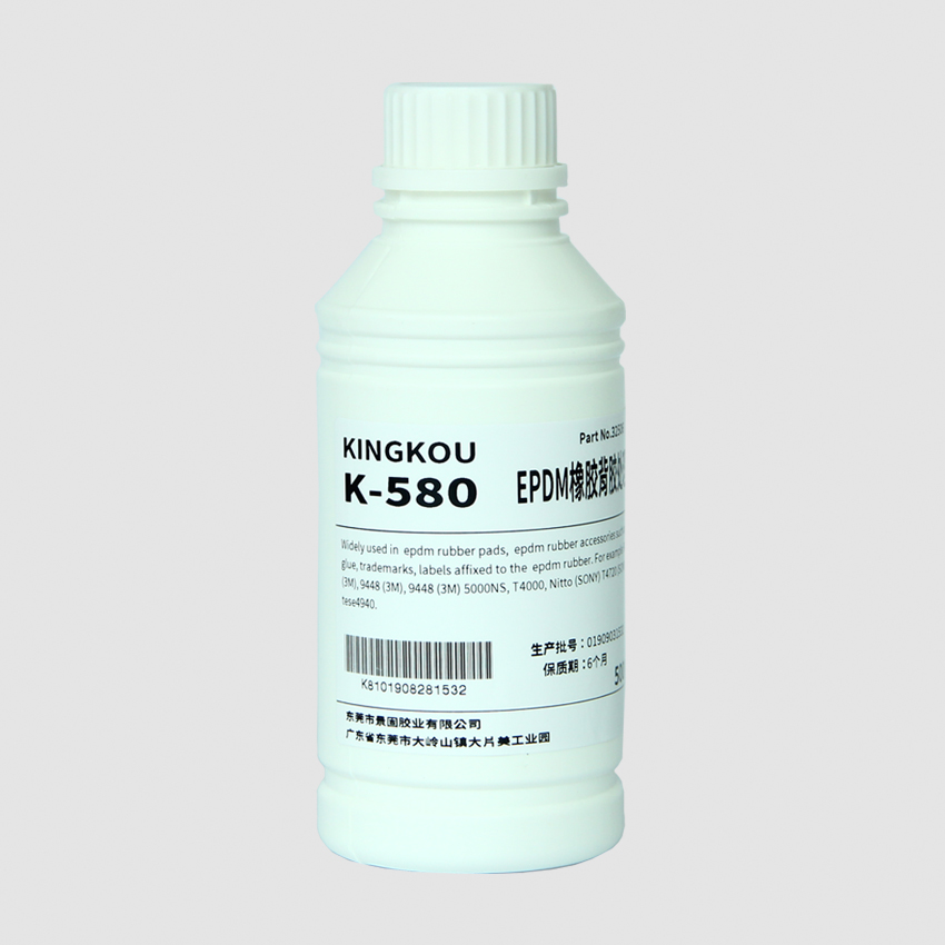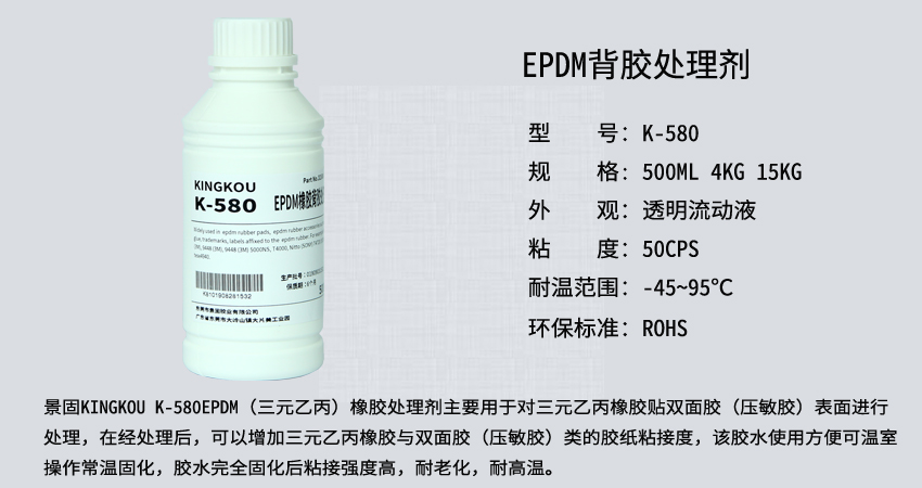 景固KINGKOU K-580EPDM(三元乙丙)橡膠處理劑主要用于對(duì)三元乙丙橡膠貼雙面膠(壓敏膠)表面進(jìn)行處理,在經(jīng)處理后,可以增加三元乙丙橡膠與雙面膠(壓敏膠)類的膠紙粘接度,該膠水使用方便可溫室操作常溫固化,膠水完全固化后粘接強(qiáng)度高,耐老化,耐高溫。