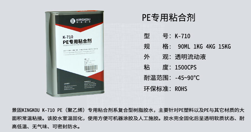 景固KINGKOU K-710 PE(聚乙烯)專用粘合劑系復合型樹脂膠水,主要針對PE塑料以及PE與其它材質(zhì)的大面積常溫粘接。該膠水室溫固化,使用方便可機器涂膠及人工施膠。膠水完全固化后呈透明軟質(zhì)狀態(tài)、耐高低溫、無氣味、可密封防水。