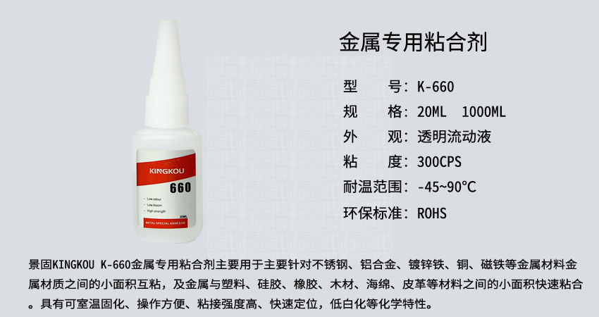 景固KINGKOU K-660金屬專用粘合劑主要用于主要針對不銹鋼、鋁合金、鍍鋅鐵、銅、磁鐵等金屬材料金屬材質(zhì)之間的小面積互粘,及金屬與塑料、硅膠、橡膠、木材、海綿、皮革等材料之間的小面積快速粘合。具有可室溫固化、操作方便、粘接強度高、快速定位,固化后的膠層具有優(yōu)異的耐水、耐熱、耐油和低白化等化學(xué)特性。本產(chǎn)品環(huán)保,符合ROHS標準。