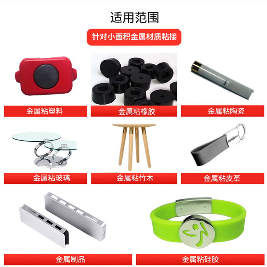 本產(chǎn)品廣泛應(yīng)用于電子、汽車、醫(yī)療器械、玩具、工程機(jī)械等各個(gè)領(lǐng)域,主要針對(duì)不銹鋼、鋁合金、鍍鋅鐵、銅、磁鐵等金屬材料的粘接以及金屬與塑膠、硅膠、橡膠、木材、海綿、皮革等材料之間的小面積快速粘合。
