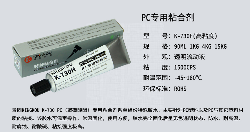 景固KINGKOU K-730 PC(聚碳酸酯)專用粘合劑系單組份特殊膠水,主要針對(duì)PC塑料以及PC與其它塑料材質(zhì)的粘接。該膠水可溫室操作、常溫固化,使用方便,膠水完全固化后呈無色透明狀態(tài),防水、耐高溫、耐腐蝕、耐酸堿、粘接強(qiáng)度極高。