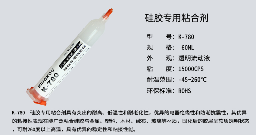 景固KINGKOU  K-780透明硅膠專用膠水系專業(yè)針對硅膠與塑料、硅膠與金屬、硅膠與玻璃、木材、絨布、皮革等材質(zhì)的粘接所研發(fā),避免了傳統(tǒng)膠水粘接后發(fā)硬變脆、出現(xiàn)白化、氣味重、耐侯性差等缺點,該膠透明環(huán)保、無刺激性異味、柔軟度好!固化后呈軟質(zhì)彈性狀態(tài),可彎折,不發(fā)白,強度高,耐酸堿,耐高溫,防水性能強!