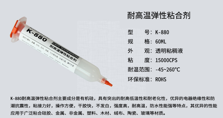 景固KINGKOU K-880耐高溫彈性粘合劑主要成分是有機(jī)硅,具有突出的耐高低溫性和耐老化性,優(yōu)異的電器絕緣性和防潮抗震性,粘接力好,操作方便,干膠快,不發(fā)白,強(qiáng)度高,耐高溫,防水性能強(qiáng)等特點(diǎn),其優(yōu)異的性能應(yīng)用于廣泛粘合硅膠、金屬、非金屬、塑料、木材、絨布、陶瓷、玻璃等材質(zhì),粘接前免處理,固化后膠層呈軟質(zhì)透明狀態(tài)。適用于對(duì)溫度有特殊要求的彈性粘接,適用于電力、電子、電器、醫(yī)療機(jī)械、傳感器、機(jī)械設(shè)備、冷凍設(shè)備、造船工業(yè)、汽車工業(yè)、電線電纜的絕緣粘接加固密封保護(hù)等。
