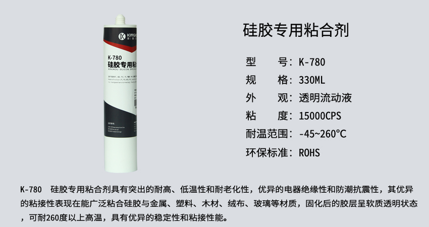 景固KINGKOU   K-780透明硅膠專(zhuān)用膠水系專(zhuān)業(yè)針對(duì)硅膠與塑料、硅膠與金屬、硅膠與玻璃、木材、絨布、皮革等材質(zhì)的粘接所研發(fā),避免了傳統(tǒng)膠水粘接后發(fā)硬變脆、出現(xiàn)白化、氣味重、耐侯性差等缺點(diǎn),該膠透明環(huán)保、無(wú)刺激性異味、柔軟度好!固化后呈軟質(zhì)彈性狀態(tài),可彎折,不發(fā)白,強(qiáng)度高,耐酸堿,耐高溫,防水性能強(qiáng)!