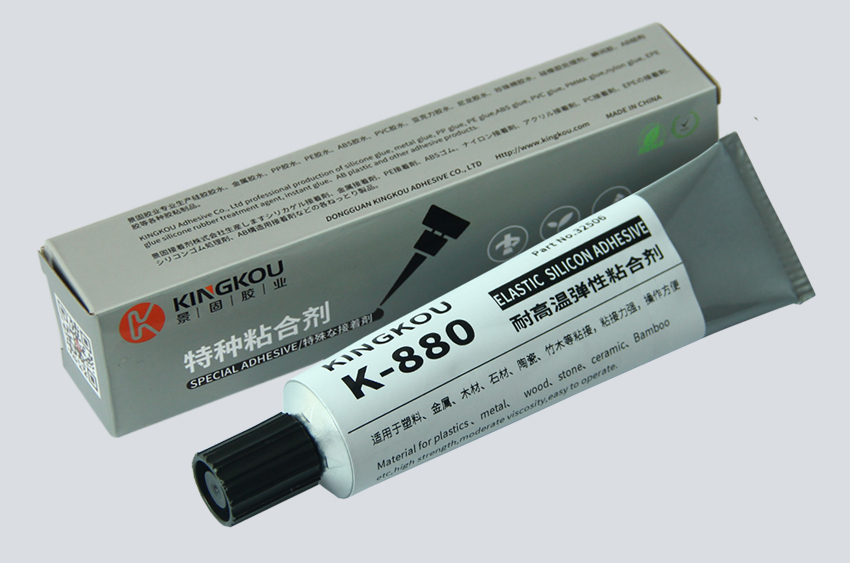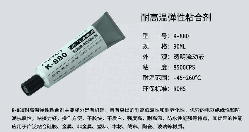 景固KINGKOU K-880耐高溫彈性粘合劑主要成分是有機硅,具有突出的耐高低溫性和耐老化性,優異的電器絕緣性和防潮抗震性,粘接力好,操作方便,干膠快,不發白,強度高,耐高溫,防水性能強等特點,其優異的性能應用于廣泛粘合硅膠、金屬、非金屬、塑料、木材、絨布、陶瓷、玻璃等材質,粘接前免處理,固化后膠層呈軟質透明狀態。適用于對溫度有特殊要求的彈性粘接,適用于電力、電子、電器、醫療機械、傳感器、機械設備、冷凍設備、造船工業、汽車工業、電線電纜的絕緣粘接加固密封保護等。