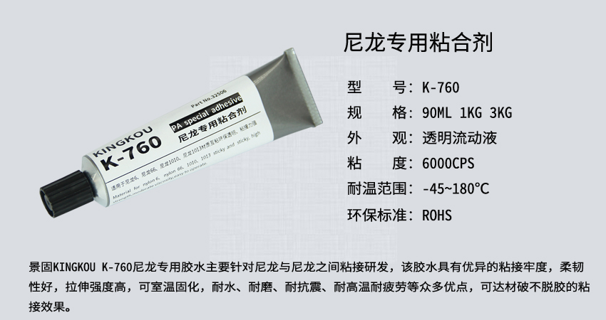 景固KINGKOU K-760尼龍專用膠水主要針對尼龍與尼龍之間粘接研發(fā),該膠水具有優(yōu)異的粘接牢度,柔韌性好,拉伸強度高,可室溫固化,耐水、耐磨、耐抗震、耐疲勞等眾多優(yōu)點,可達材破不脫膠的粘接效果。